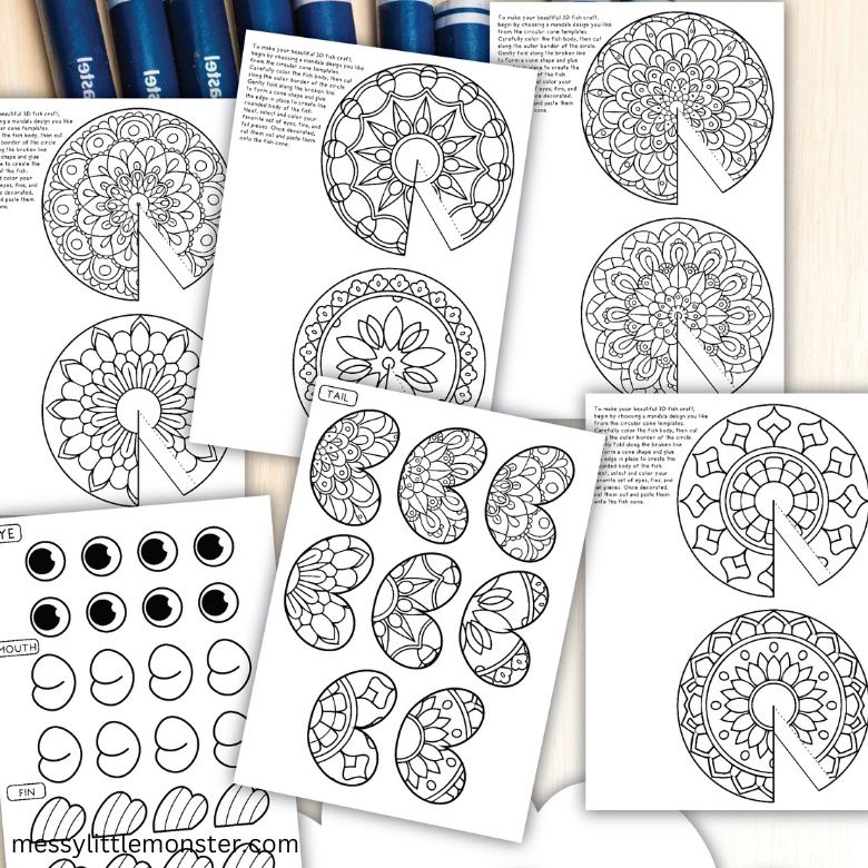 To make your 3D fish craft, begin by choosing a mandala design from the circular cone templates.